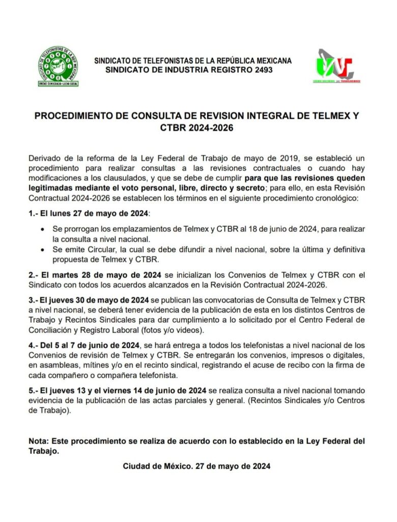 En su participación del dia 27 de mayo, el compañero Francisco Hernandez Juarez, nos comenta sobre los cambios hechos a la ley, por lo cual tenemos que seguir el protocolo de difusion y publicación de los acuerdos, para que en su momento realizar la votacion por parte de la base. Todos estos pasos se deben de realizar de acuerdo a la ley en el previsto de que si no lo hacemos, la empresa puede levantar una queja por falta de procedimiento y en su caso desconocer los acuerdos.