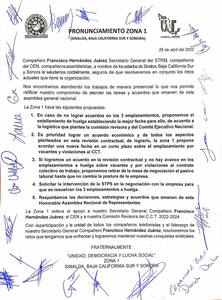 Compañeros, derivados de los trabajos realizados en la revisión salarial y contractual 2022-2024, les presento el segundo pronunciamiento de la zona 1.